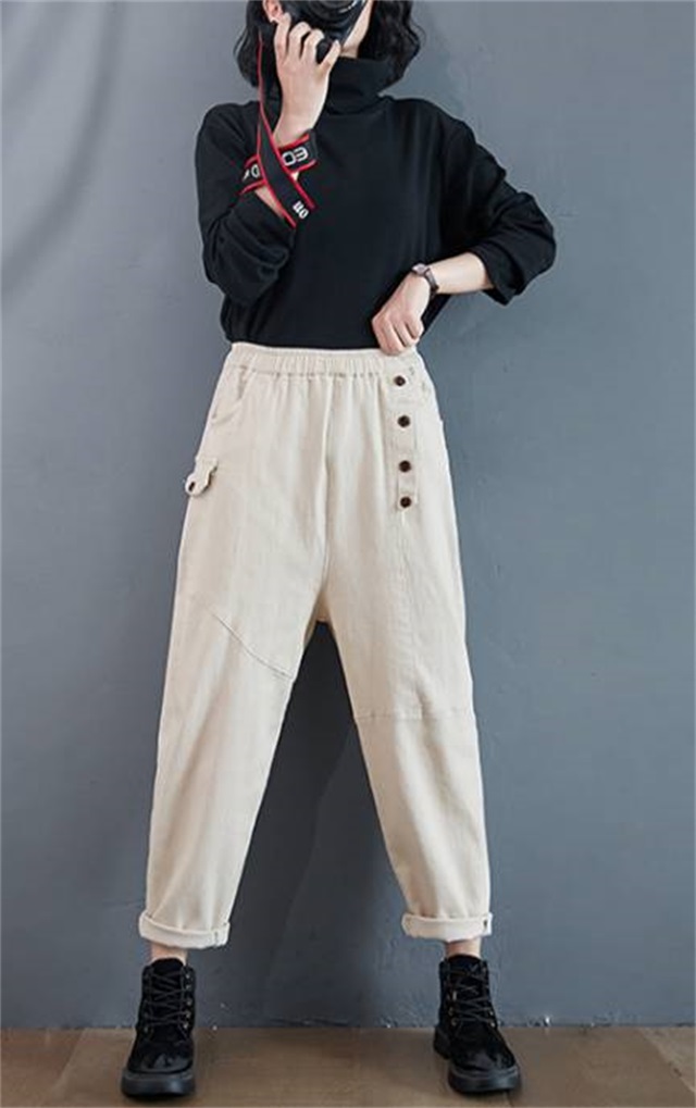 米色裤子不宜搭配很深色上衣、条纹上衣或皮衣。