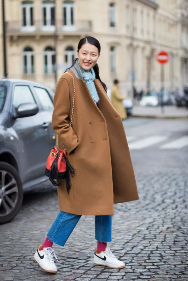 4. 白色球鞋+墨绿色长袜:穿一件黑色羊羔毛机车外套,内搭黑色高领毛衣,下身穿一条黑色小皮裙,配上墨绿色长袜,再穿上白色球鞋,墨绿色的长袜最好选择带条纹装饰的,这身搭配颜色都是比较整洁干净的,没有什么装饰物,用条纹堆堆袜点缀,可以增加这身衣装的亮点,显得有层次感。