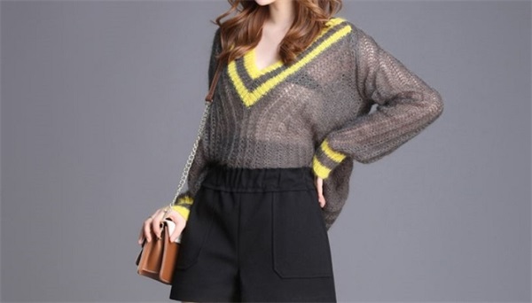 毛呢短裤可以搭配V领毛线衣,可以打造出一种成熟性感的形象魅力,也很适合活泼可爱的女性穿着。为了搭配V领镂空的毛线衣,其内打底既可以选择保险的肉色打底,也可以大胆选择撞色的带底衫,与V领毛线衣一起搭配出别样的风格。