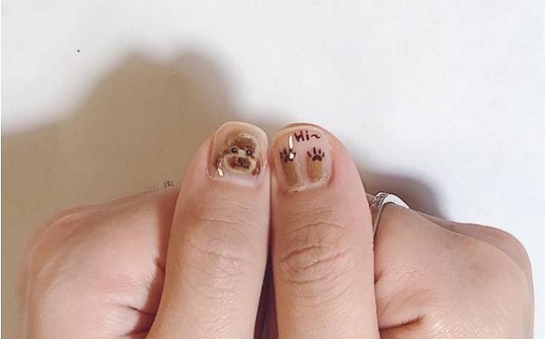 5、用浅棕色甲油在右手大拇指的长方形色块上拉花,作为泰迪的腿部,再用黑色甲油点涂出泰迪的梅花脚掌并写上可爱的文字即可。