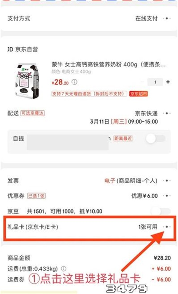 8、在京东app点击购买想要买的自营商品,在订单页面点击【礼品卡】选项;