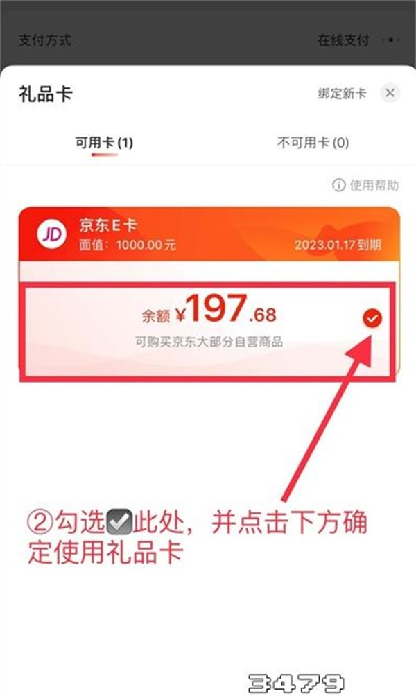 9、在【可用卡】页面勾选一张购物卡,再点击确定即可成功使用购物卡购买东西。