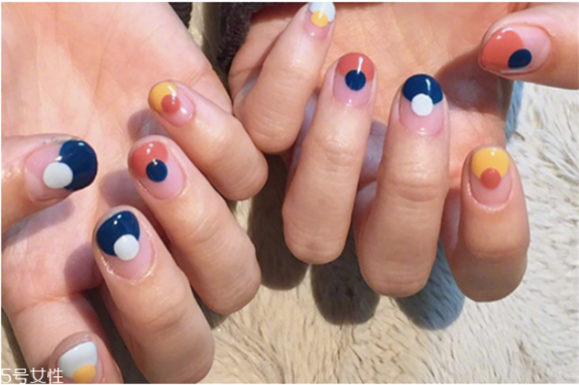 姜黄色、橘红色、藏蓝色、天空蓝色甲油画出半圆法式美甲,不规则的配色方式点缀出圆点,推荐给刚进入职场的女生和学生党。