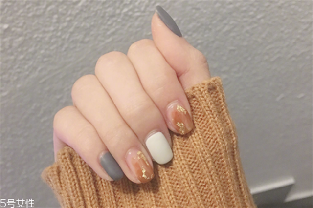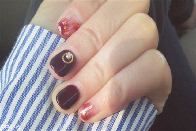 大多数人会觉得加上金色元素会觉得老气、土,但最这里选用了金箔细细地贴在晕染美甲上,非常适合秋冬并极具档次~