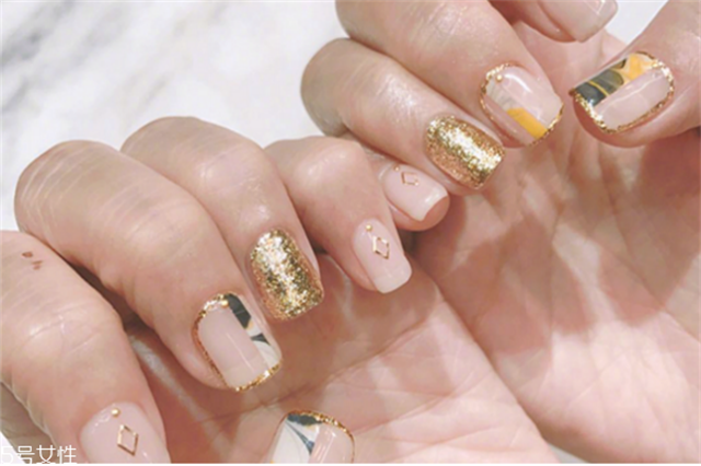 这款美甲大量使用了金箔与透明甲油,高级又不失简约的一款。