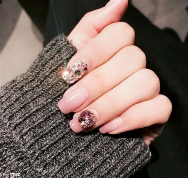 裸色的美甲颜色,是和肤色比较接近的颜色,涂抹这样的指甲油颜色,让你的手部曲线看起来都特别的优雅呢,还有闪钻的点缀,亮片设计出不同的造型,单单这样看就很小清新美腻了,冬天要美甲必选的指甲彩绘。