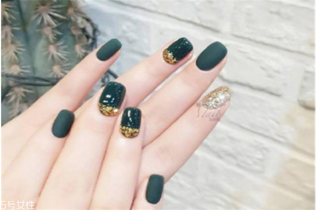 亮面和磨砂甲的搭配是今年很流行的款式,搭配上墨绿色之后,又显白又高级。