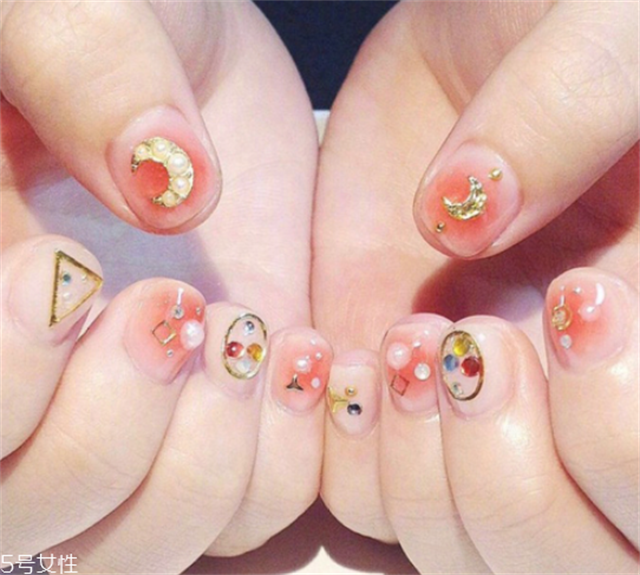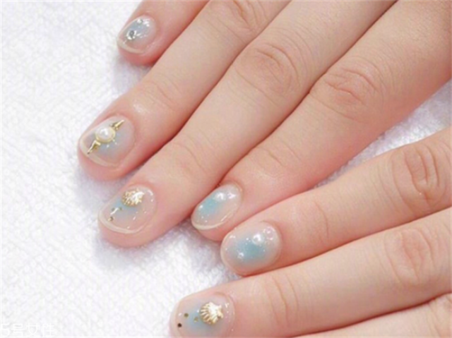 好小清新的一款渐变色美甲,不管是橙色还是淡蓝色,都是不错美甲款式呢。加上小饰品点缀,整个美甲还相当大气。