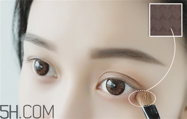 再使用深一点的哑光深棕色叠加在双眼皮褶皱处,和整个下眼睑处!这样可以打出一种刚刚睡醒的朦胧感觉!