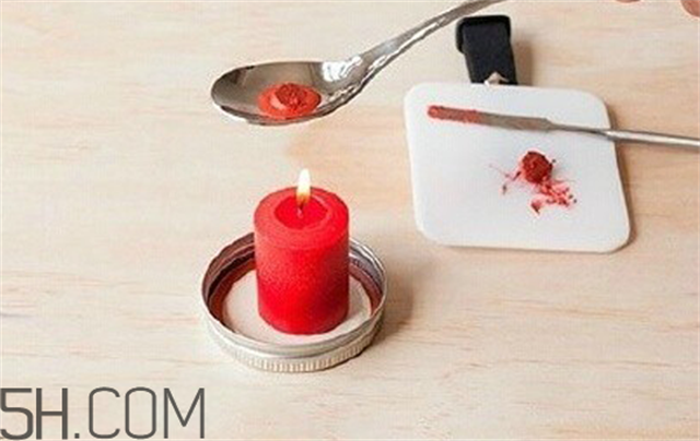 第二步:将断裂的口红彻底切断,取其中一段,放在勺子上,隔火融化。