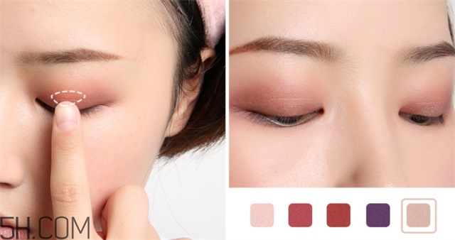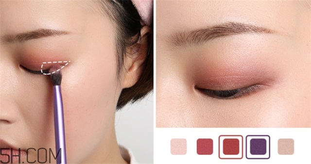 第三步用眼影盘中下方的暗红色和烟紫色调和一下,叠加在眼尾做阴影。用打圈的方式稍稍带到眼皮中央,弱化一下两个色块的边缘。