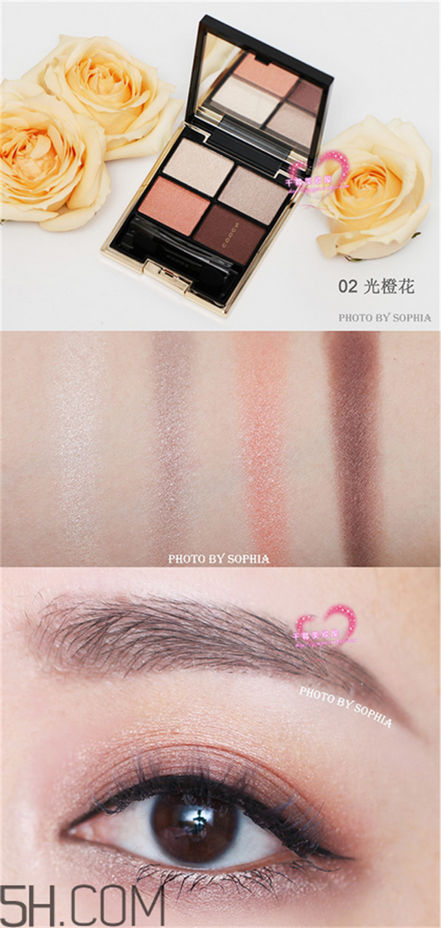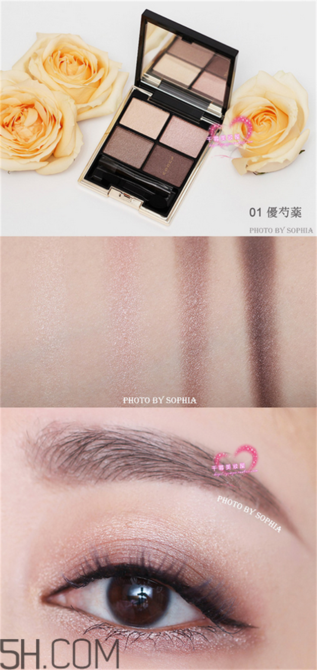 01優芍薬,棕色系,是最基础最实用的盘子;芍药基本上就是我们常说的白芍,花型类似牡丹,但寿命却不如牡丹几十年的长,美丽甚是短暂。这个色可以说是基础色调,不会太失手的有配色,简单就能画出SUQQU干净的眼妆,香槟粉晶色带粉、带红调,能让整个眼神更能因此柔和,温柔许多。如果你没有接触过SUQQU的眼影,可以从这盘开始哦~