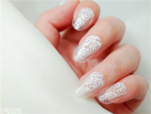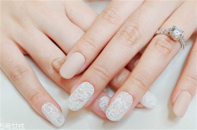 3、复古蕾丝。婚纱选择复古蕾丝的你,可以在裸色指甲中加入镂空设计白色蕾丝,迷人且优雅。像这样的蕾丝做十指就会显得太过华丽,配上雾面的裸肤色,更显得气质。