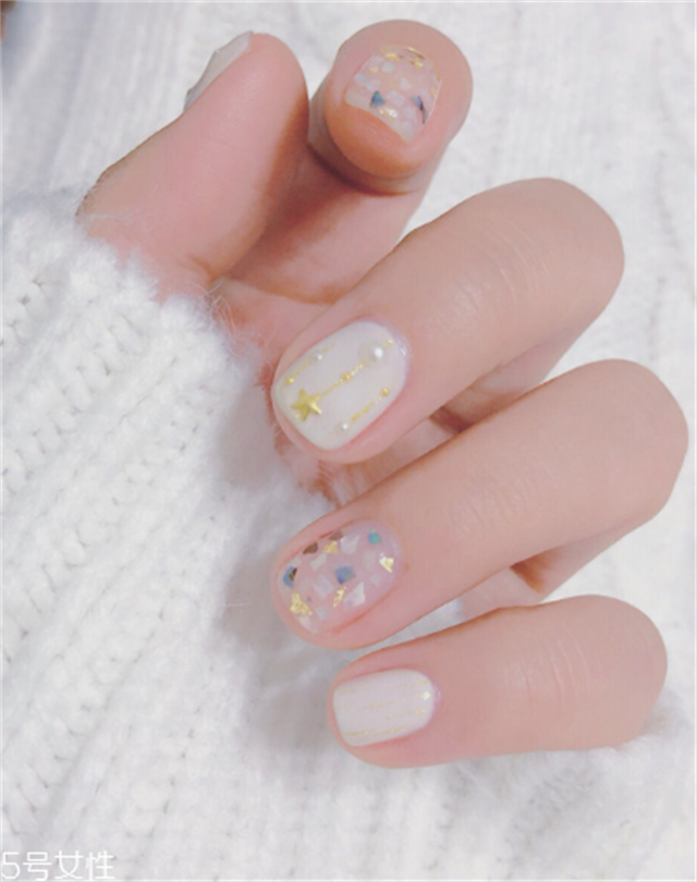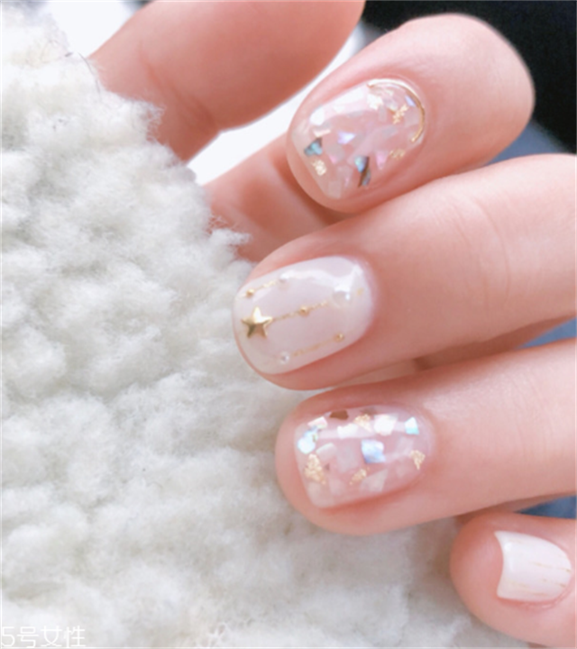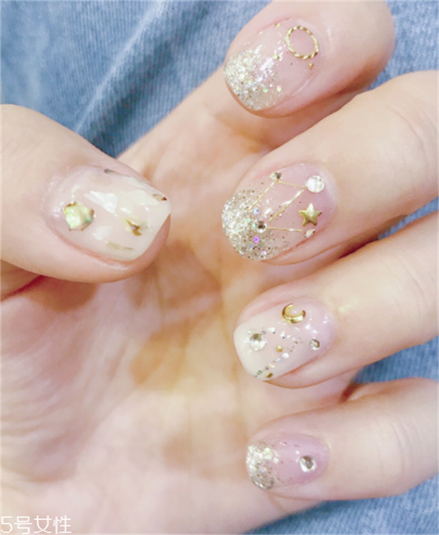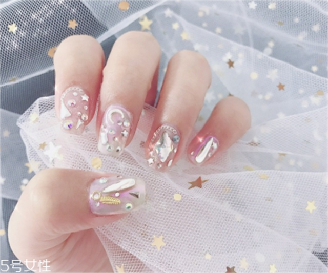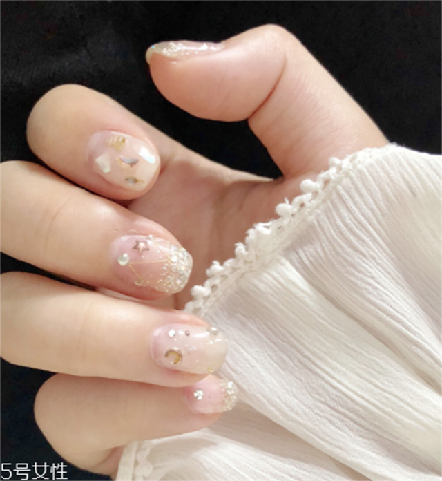 星空的感觉更有仙气。一定要搭配小小颗的钻和铆钉。会显得很精致哟。然后婚礼结束了也没觉得指甲很浮夸,还是感觉很日常呢。搭配蕾丝衬衫超级美!
