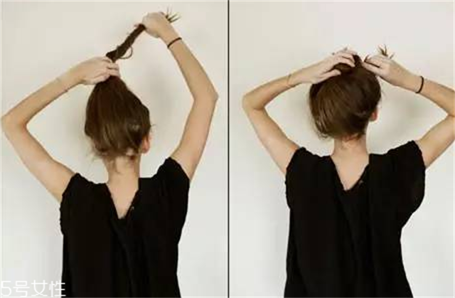 Step3:一个手固定底部头发,另一手将拧紧的头发顺着底部缠绕