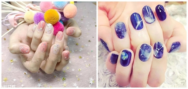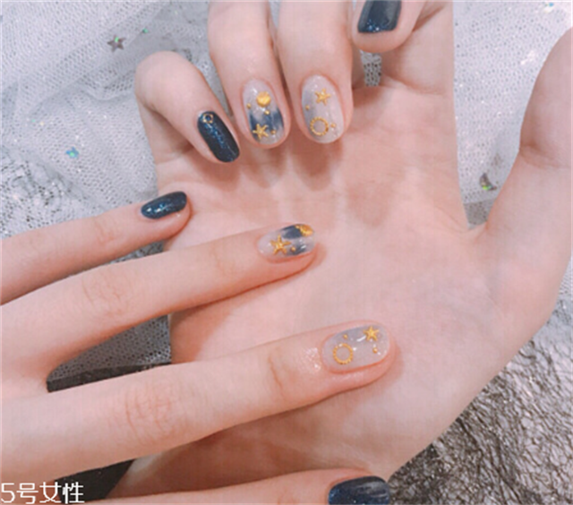 3、星月元素美甲:星月美甲这两年可以说是比较的流行,不仅因为它的简约,而且能够让人觉得,看到它就像看到了满天繁星闪烁的样子,不仅很有气质,而且一点也不觉得单调,关键是不挑肤色好驾驭。