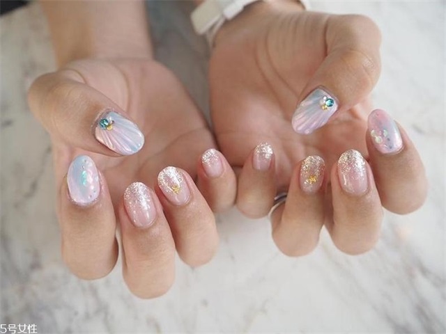 4、贝壳元素美甲:一看到贝壳,你是不是首先想到了海洋呢,是的,如果在指甲上有贝壳的元素,就瞬间感受到了大海的感觉,而且贝壳立体的肌理感,也能够让你的指甲仙气感十足。跟贝壳元素有着异曲同工之妙的还有水波纹的美甲,那种波光粼粼的感觉,真的是让自己觉得就在水中央了呢。