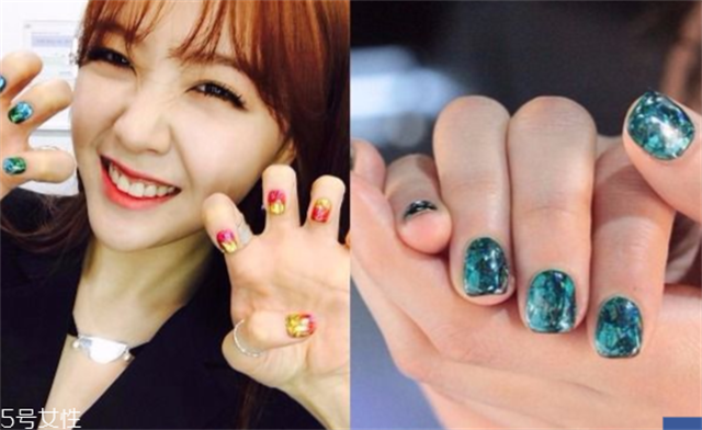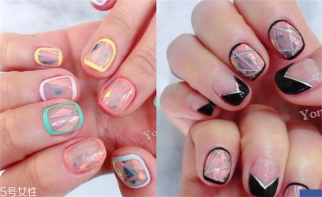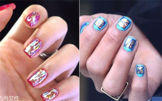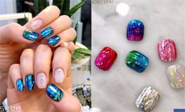 2、韩妞趋势雷射玻璃宝石美甲不得不追!最近韩国美甲的大势是在指甲上贴上一层又一层的雷射玻璃贴纸,指甲在玻璃贴纸的交错变化下,增加层次感,就像真实宝石在指甲上发光发亮!