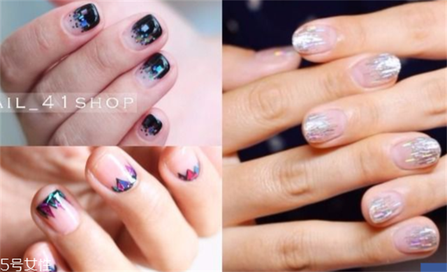 5、局部的简约几何可以让手指看来更修长!如果希望宝石美甲的效果低调隐约一些,可以剪下一些几何玻璃贴纸黏在指甲前端或用金葱来做点缀,局部的美甲也能让手指看起来修长许多。