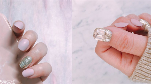 3、粉色调宝石美甲超有气质。以柔和的粉色调当基本底色,搭上钻石光泽的透明贴纸,让指尖气质大提升,而温柔色泽配上闪耀的宝石所创造出的对比感,指甲让整体更加时髦。