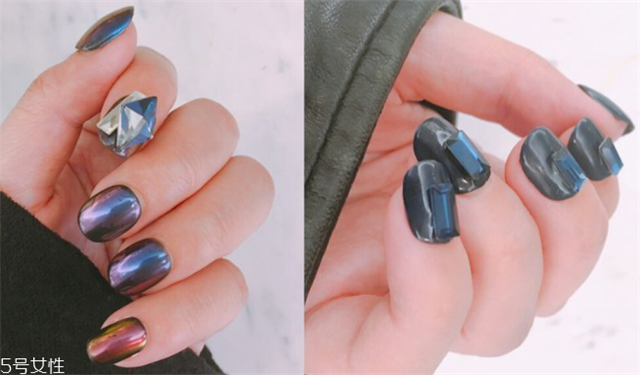 9、低调深蓝的霓光,打造出迷幻美钻。运用金属霓光美甲效果,搭配俐落的钻石切面,展现出个性时髦的美甲效果。