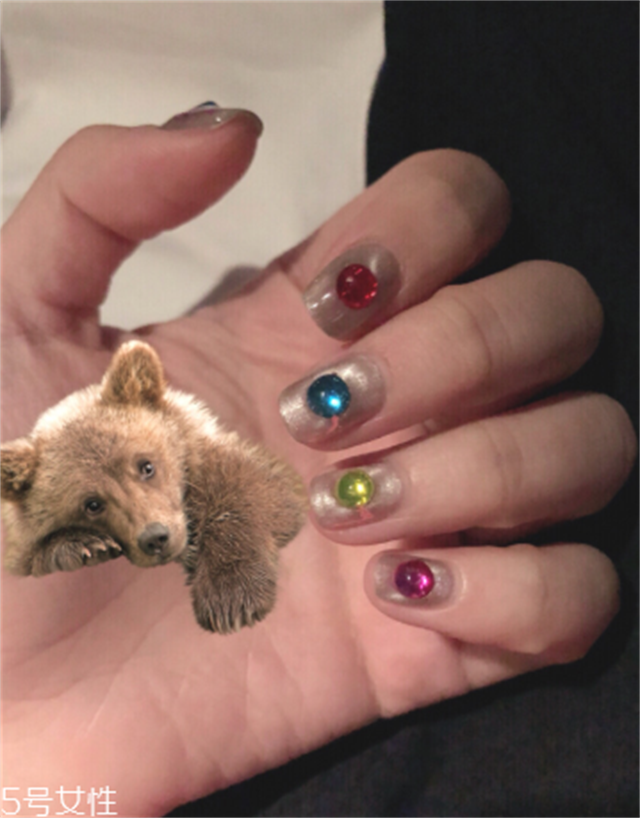 用白**眼铺底,每个指头上用不同宝石点缀,大拇指用宝石和亮片拼成花朵的形状,拍照很上镜哦。