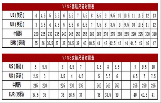 大家在选购的时候可以参照尺码对照表进行选择,举例一般阿迪运动鞋穿40尺码的,VANS选39码数就可以。如果实在不知道自己穿多大码数合适,可以量一下脚长,脚后跟到脚尖最长的长度,对比VANS鞋子的内长,当脚长低于哪个内长,就选哪个内长的鞋子下单。