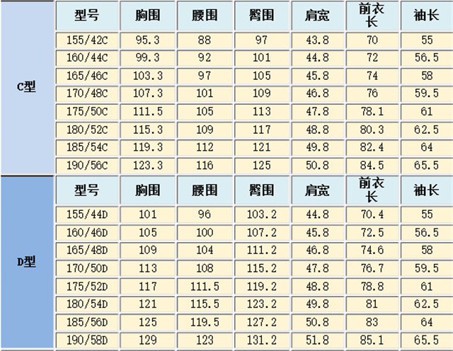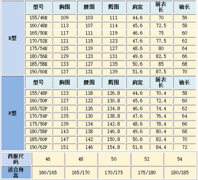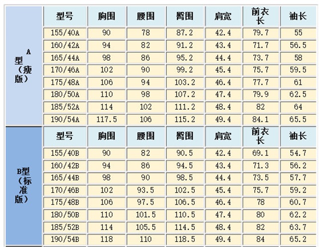 1、根据我国的相关国家标准,成年男女的西服尺码对照表都是用“号型制”来表示的,西服也不例外。“号型”,包括“号”、“型”、“体型”三部分。其中,“号”表示人体的身高(用cm表示,以5cm为一档);“型”表示人体的净胸围(上装,一般以4cm为一档)或净腰围(下装,一般以4cm为一档)。
