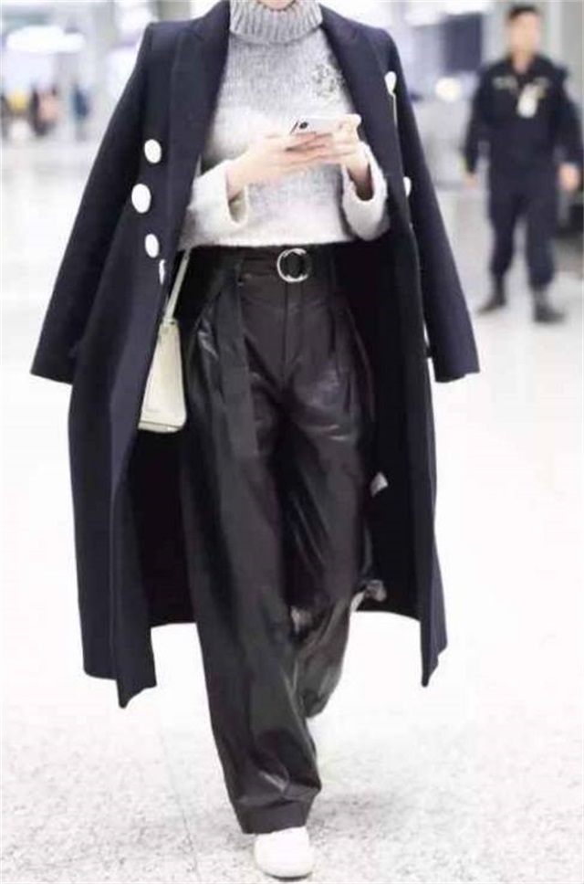 黑色毛衣搭配黑色阔腿皮裤,这样的搭配会让整体搭配更有型,黑色阔腿皮裤本来就是一个亮眼的存在,让灰色毛衣进行中和,正好可以减低锐气。