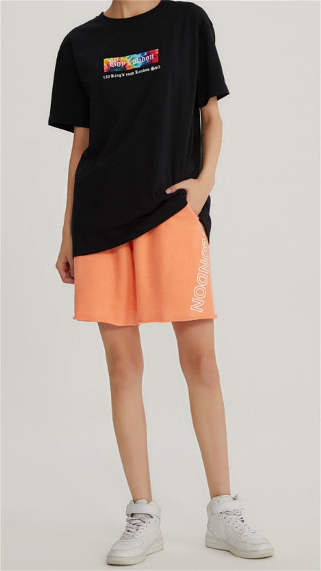 5、橙色短裤配黑色上衣黑色也是百搭色,无论配什么颜色都很适合,橙色也不例外。如果再配上黑色鞋子更是完美,颜色产生强烈对比,称的人更有精神,恰到好处地运用色彩的两种观感,不但可以修正、掩饰身材的不足,而且能强调突出你的优点。
