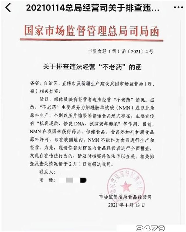 好景不长,在2021年1月13日,国家市场监督管理总局印发的《关于排查违法经营“不老药”的函》流出,函件内说明,要求各省排查有无违法经营“nmn不老药”的情况,并且在该函中明确指出,“在我国境内,nmn不能作为食品进行生产和经营。”