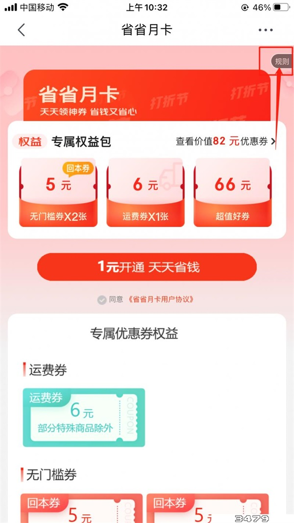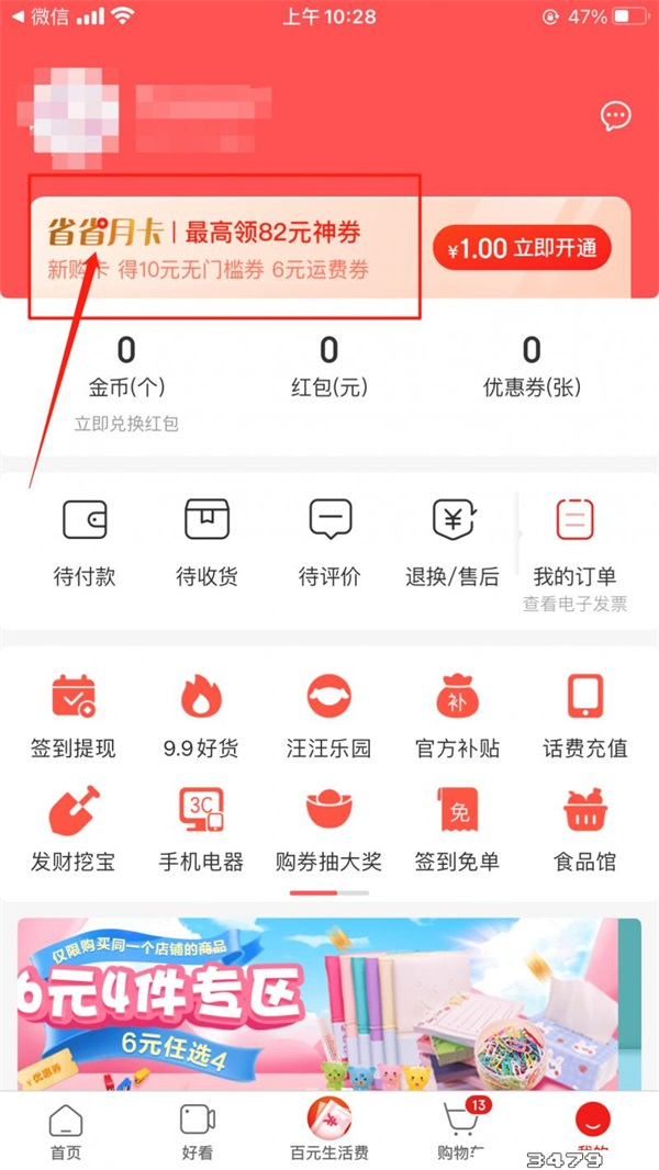 3、点击并进入上方【省省月卡】界面;
