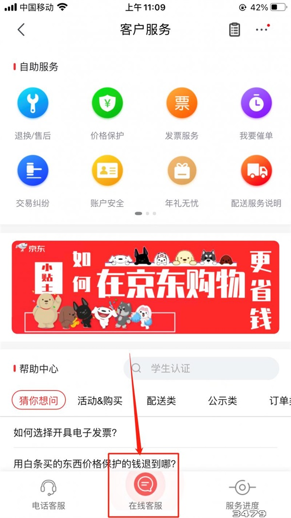 4、在【客户服务】页面找到下方中间【在线客服】功能,点击进入;