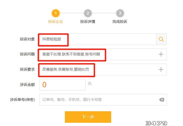 3、根据实际情况填写,注意投诉对象是【抖音短视频】;