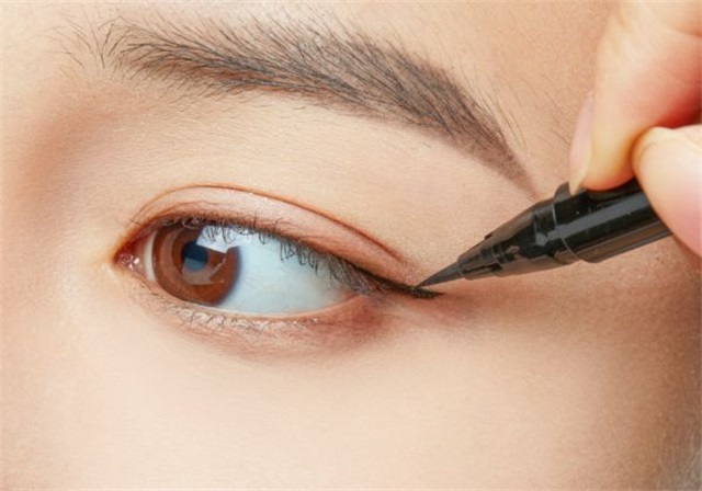 头微微上仰,镜子稍低,眼睛看向镜子,然后轻轻的在睫毛根处用咖啡色眼线笔描绘一条细细的眼线,眼尾拉长即可。