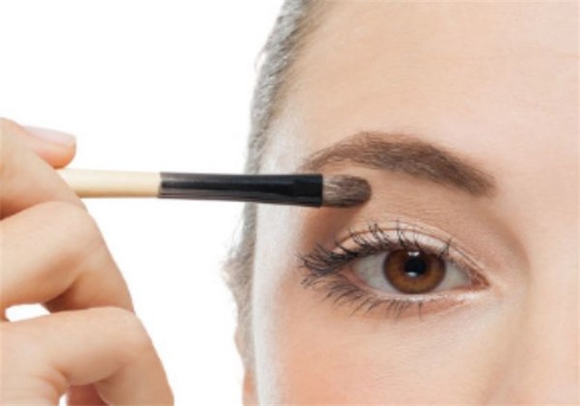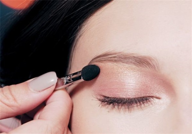 第二步 使用与肤色相近的棕色眼影刷在上眼皮,从睫毛根部晕染至整个眼窝。