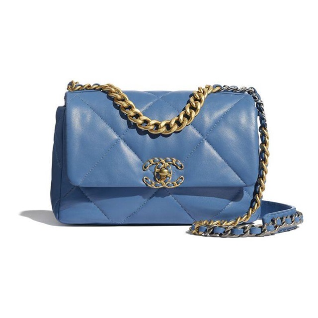 Chanel19皮革链袋,优雅大方的柔软湖水蓝色羊皮链袋结合双C扣,表现出从容不迫的时尚态度。($43,700)