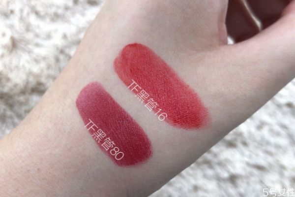 首先,我们看一下他们的相同之处。TF80和TF16同属于TomFord黑管系列,所以包装都是很高级的黑金搭配,除了底部标注的色号颜色不同,其他就没啥区别。TF黑管80和16口红质地也都很滋润,上嘴以后特别舒服,很顺滑,上色均匀,容易涂抹开,没有结块的现象,不拔干,不显唇纹,显色度很高。当然,粘杯和持久度不是很好,也是TF80和TF16的共同缺点,大家涂上以后可以用散粉盖一下,或者用纸巾抿一下,来来**两三次,这样会更持久一些,不需要经常补妆。从膏体颜色来看,肉眼真的不是很好分辨,咋一看,还真是差不多,就跟孪生姐妹花一样。但其实他们涂在嘴唇上的效果,完完全全是不同的,差别很大。