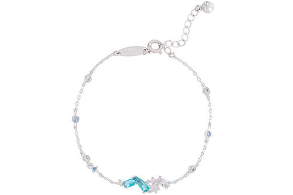 noonoofingers这款手链蓝绿钻相结合,手链上还有有几颗小钻珠,蓝色水钻搭配白色,超美,让人忍不住想要拥有。手链扣子也是活动的,手链背面的椭圆牌子上有自己品牌的logo,戴出去不容易跟别人撞款,令人心动。手链比较纤细,戴起来让人感觉手也纤细。