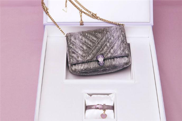 2.“七夕情人节”特别款礼物套装,内含一个手袋和一枚手镯。“SerpentiCabochon”系列迷你手袋采用柔软的马特拉塞凸纹薰衣草色金属质感水蛇皮材质,饰以图形图案,25000RMB。