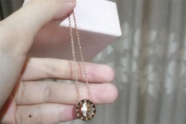 吊坠有些分量,并没有廉价的塑料感。项链上的罗马文印刻清晰,中间的小钻环是可活动的,非常精致。链子是细链,戴上去差不多就是锁骨的位置,很合适。
