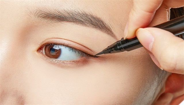 用眼线笔顺着睫毛根处画上眼线,在眼尾处,把眼线画得向上微翘即可。再依样画下眼线即可。