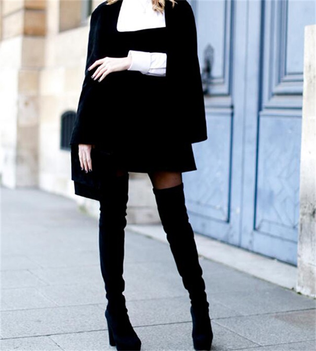 过膝长靴搭配短裙,俏皮又时尚,长度也刚好衔接起来,中间差一点点也没关系,可以穿厚的打底袜,非常显瘦哦。