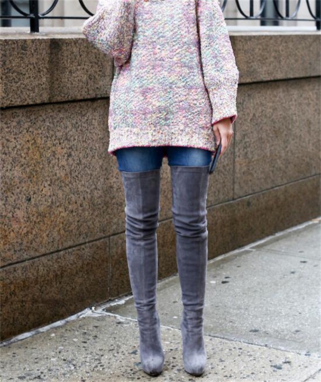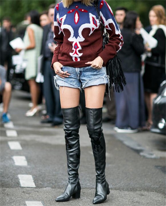 过膝长靴搭配短裤,这样的搭配非常时髦,超过膝盖的短裤一般会显矮,但是高跟过膝长靴正好弥补了这个缺点,上身搭配宽松毛衣,整体搭配非常有层次感,很时髦。
