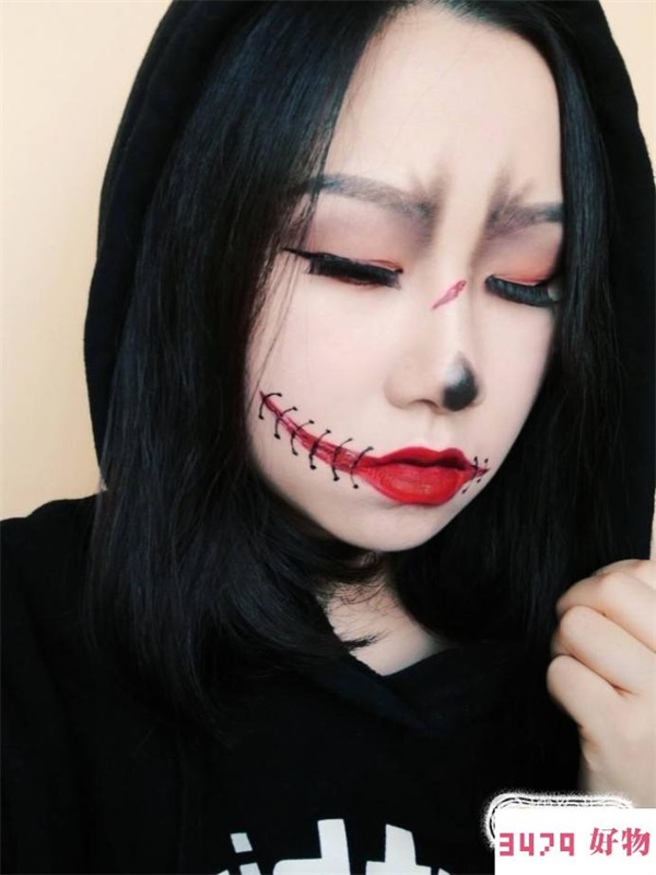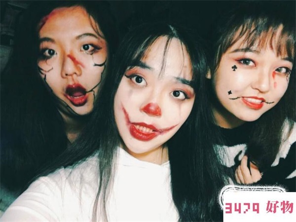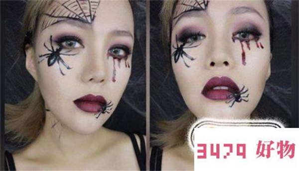 01先从简单的说起吧。毕竟手残星人还是占大多数的,有一些比较简单的妆容可以学一学。普遍万圣节妆容都是用深色眼影,黑色最为推荐,可以在眼角下面画些红色的营造流血的恐怖效果或者其他诡异的图案。想要效果更佳可以佩戴美瞳。