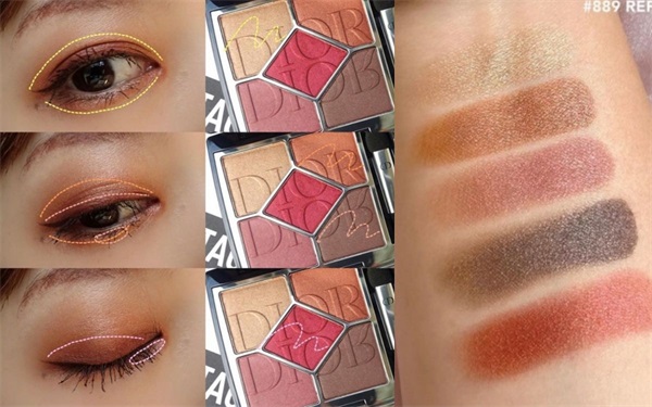 Dior迪奥经典五色眼影#889REFLEXION微醺枫红Step1 先使用左上角金色在整个上眼皮及下眼睑刷上Step2 再用右上角橘色刷在眼褶处及下眼尾往前2/3Step3 接着用右下角咖啡色于睫毛根部画上眼线以及加强下眼线中间部位