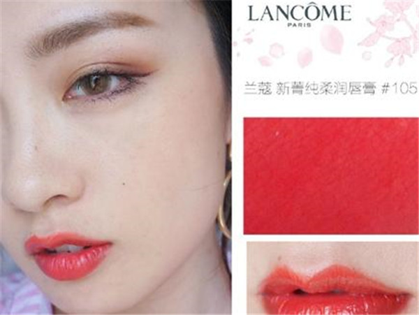 105#带橙调的珊瑚红,非常的元气显白,黄皮用上也不会气色不好,我觉得适合所有肤色。质地顺滑,这款是丝亮的质感,很滋润,我唇部无打底,直接涂完全没有涂不匀的情况。相反,就像是润唇膏一样顺滑,但是同时又很上色。颜色出来是很清透的感觉,超级的美。持久度也很好,不吃不喝大概四五个小时不掉色,卸妆液很好卸掉,超级推荐。