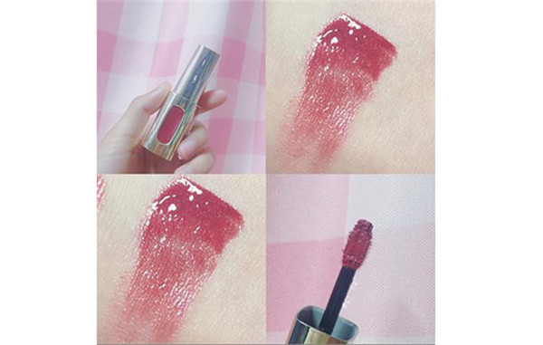 这个颜色上嘴后有点砖红色的感觉,但是颜色的亮度会高一些,颜色真心的好看,带有一些七彩细闪,很显白,而且玻璃唇的质感也很显格调。
