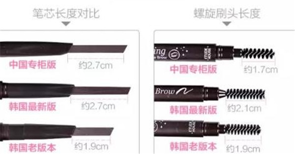 笔芯的长度新版的中国和韩国是一样的2.7cm,韩国老版本会短一些1.9cm,差距很明显。