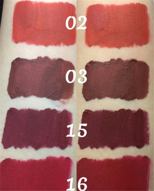 唇釉质地是特别哑光的那种,干的挺快,显唇纹是一定的,02土橘调调,其次16苹果红偏暖调,这两只都比较适合黄皮。